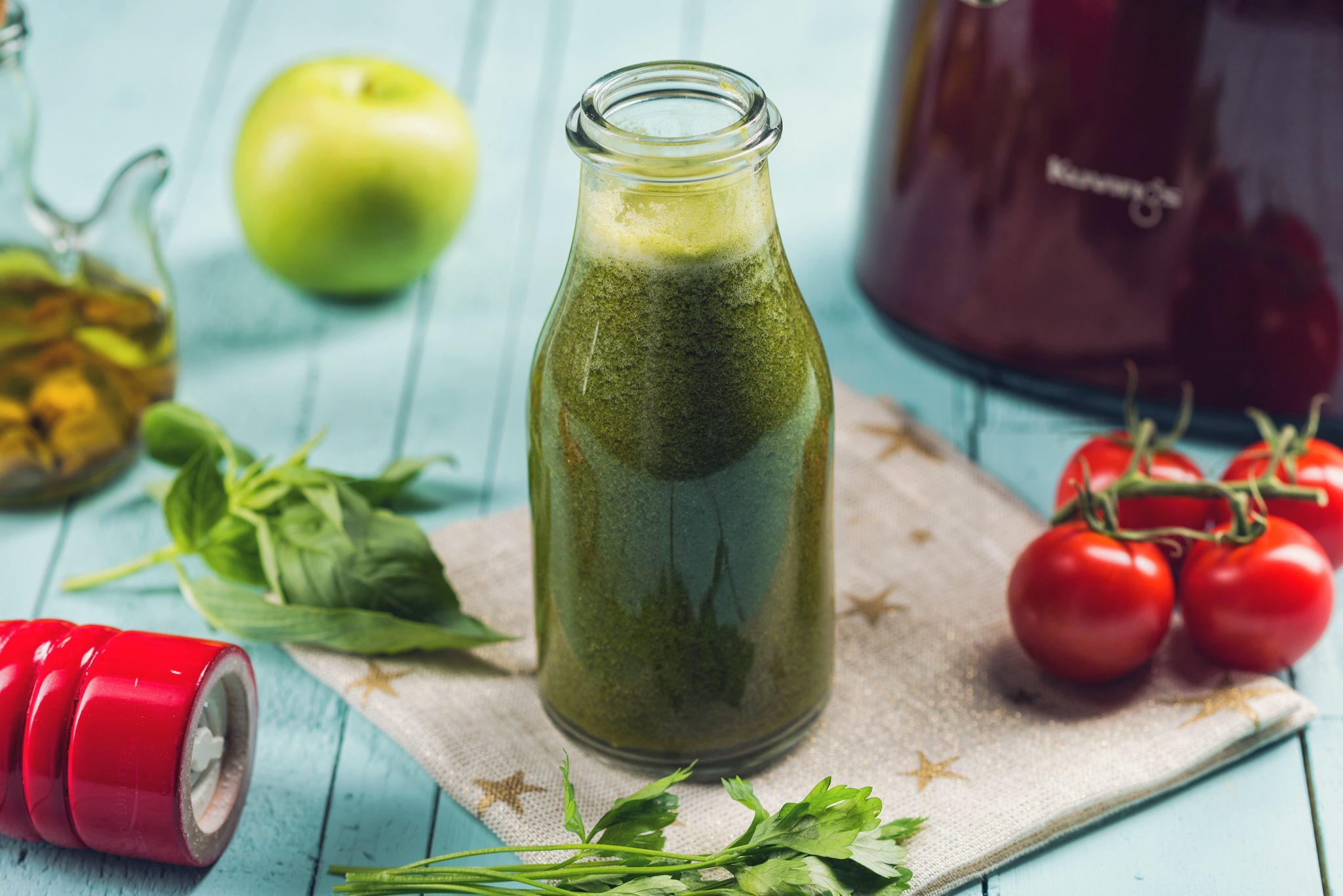 Se monteaza sita pentru suc. Se spala ingredientele si se introduc pe rand in storcator. Dupa ce se toarna sucul in pahar se adauga sarea si uleiul de masline pentru o mai buna absorbtie a licopenului. Sucul trebuie baut imediat dupa preparare. Detalii despre storcatorul prin presare la rece Kuvings gasiti AICI